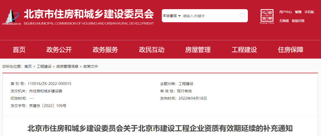 按照《住房和城乡建设部办公厅关于建设工程企业资质统一延续有关事项的通知》(建办市函〔2021〕510号)要求,我委就《关于北京市建设工程企业资质有效期延续的通知》(京建发〔2021〕409号)补充通知如下: