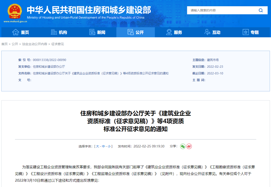 2022年2月25日,住建部发布《建筑业企业资质标准(征求意见稿)》等4项资质标准,并公开征求意见。公开征求意见截止时间为2022年3月10日。