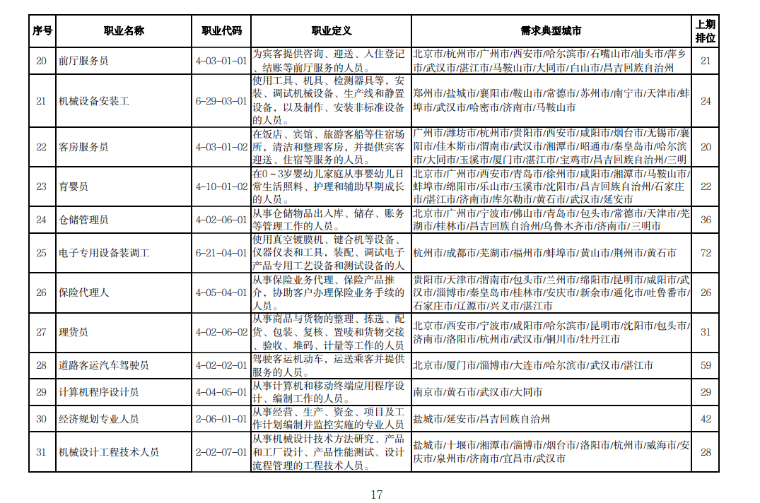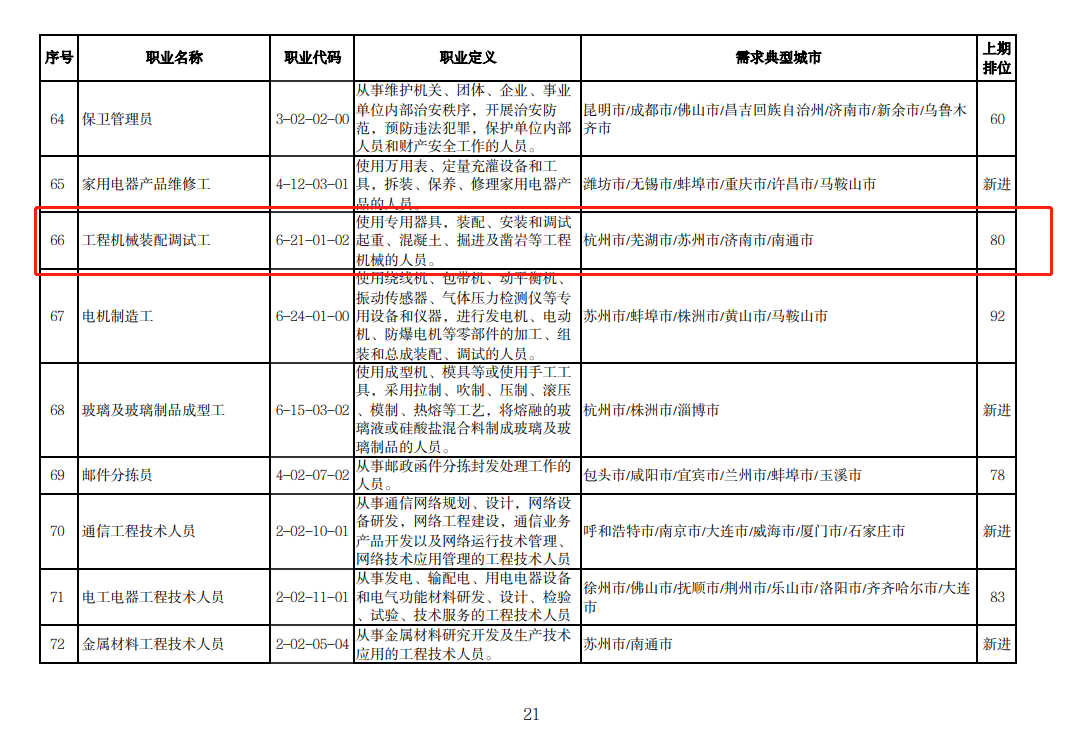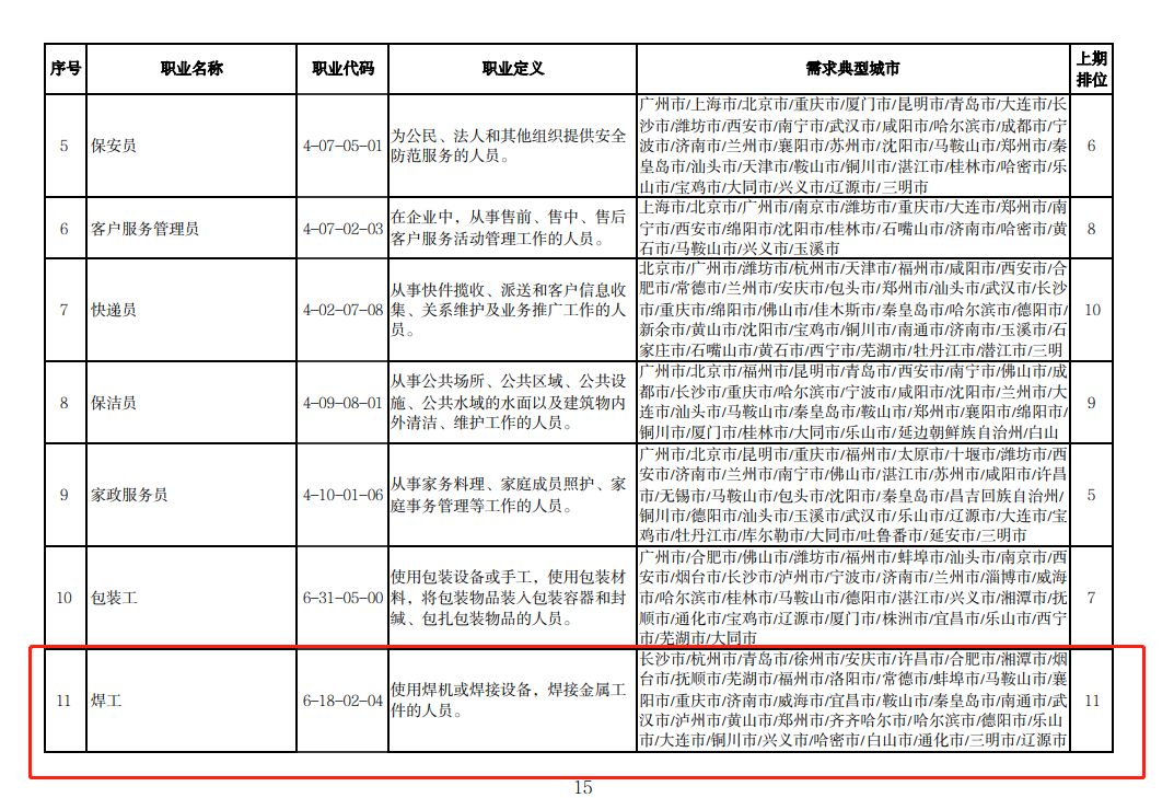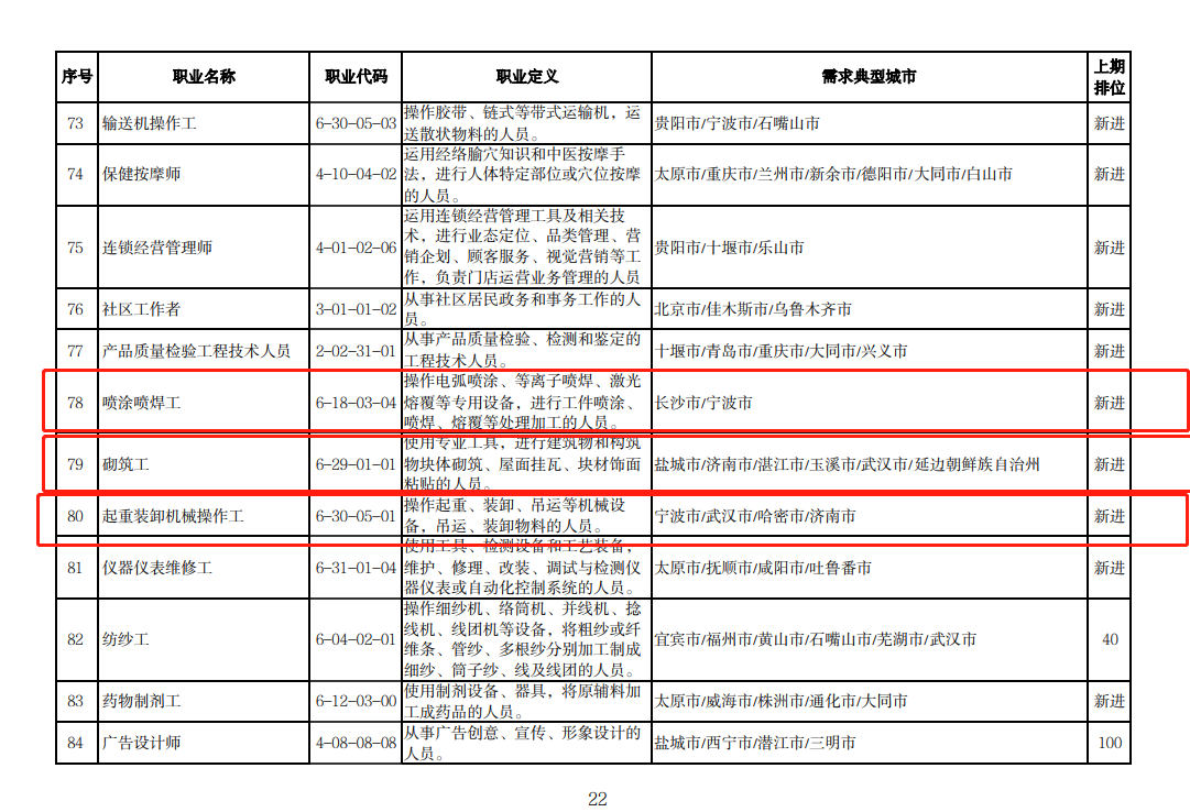 近期,102个定点监测城市公共就业服务机构收集汇总2022年第一季度人力资源市场供求关系较为紧张的职业岗位信息,形成“2022年第一季度全国招聘大于求职‘最缺工’的100个职业排行”,焊工、砌筑工等职业上榜。